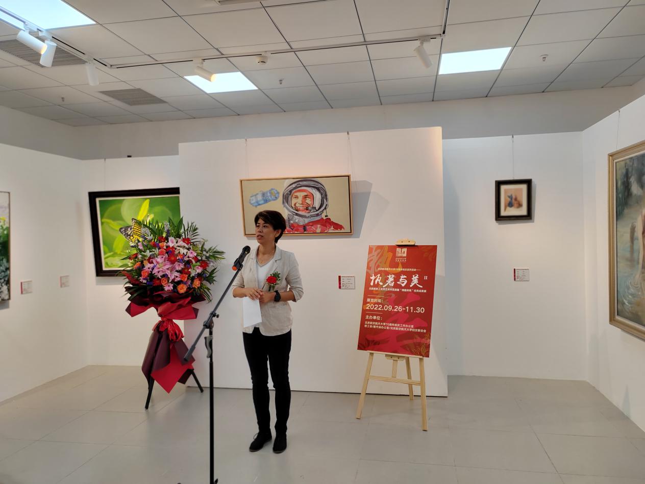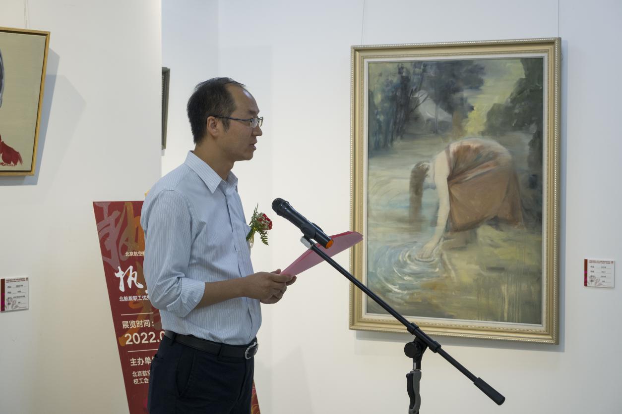 顾广耀在发言中指出,在迎接党的二十大胜利召开、庆祝北航建校70周年之际,沙河校区迎来了首次教职工艺术作品展,为校园增添了浓厚的艺术气息。学校近年来大力推进“双核发展”理念,沙河校区一直致力于打造理工人文元素交融的校园文化。校园对广大师生而言,不仅是工作学习的地方,更是情感和心灵的家园,这个家园肩负着创新发展的历史使命,同时也承载着孕育高雅文化的使命。本次在沙河展出的近200件作品,不仅让人感受到美的享受,从中更能深切的体会到北航教职工在科研、教学、管理服务岗位上兢兢业业的同时,不懈的追求精神之美、发现生活之美、创作艺术之美的那份执著。期待广大教职工有更多、更好的艺术作品来装点沙河校园,共同提升学校美育工作的格局,借艺术创作与青年学子产生情感联结和共鸣。