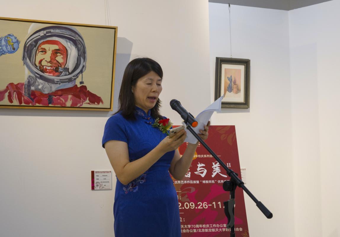 程文浩在致词中指出,在迎接北航建校70周年之际,为表达和抒发教职工对学校深厚的热爱之情,校工会联合校庆工作办公室特举办本次展览。本次展览作品主题鲜明,内容丰富,风格多样,凝结了广大教职工艺术智慧的结晶,也凝聚了“博雅师苑”优秀的办学成果,具有一定的思想性、艺术性和观赏性,充分展现了北航教职工执著高雅的精神内涵与奋发向上的精神风貌。艺术之花的竞相绽放得益于艺术沃土的深厚滋养,“博雅师苑”争做北航校园美育工作的一方沃土。继2019年举办首届“博雅师苑”优秀作品展,值此北航建校70周年之际,校工会特推出第二届“博雅师苑”优秀作品展。校工会将继续秉承关心关爱教职工、为教职工提供精细服务的理念,将沙河校区“博雅师苑”教职工兴趣课堂越办越好,为丰富沙河校区教职工的业余文化生活、为沙航校园美育工作做出更大贡献。