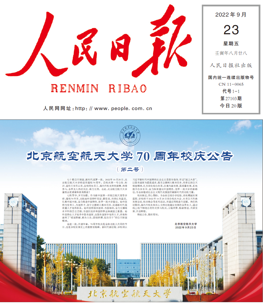 校庆渐近,同心期盼。为全面总结办学经验,系统擘画发展蓝图,学校将于2022年10月25日举办校庆大会、未来空天科教发展论坛、校庆晚会等系列活动,并通过网络进行直播。我们热切期待,海内外校友和关心支持北航建设发展的各界友人,通过线上线下相结合的形式参与校庆,云端欢聚、畅叙情谊、共谋发展、共创辉煌。