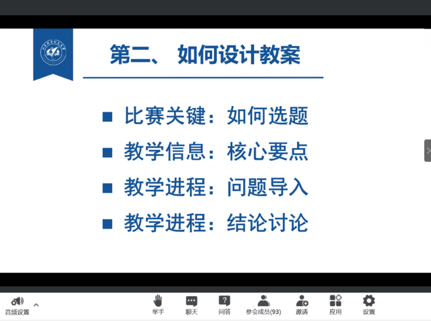 此外,张有光教授针对比赛的教案设计,结合实际案例,从如何选题、教学目标、学情分析、教学重点难点、教学进程等环节进行了详细解读,为教师们备赛指点迷津。
