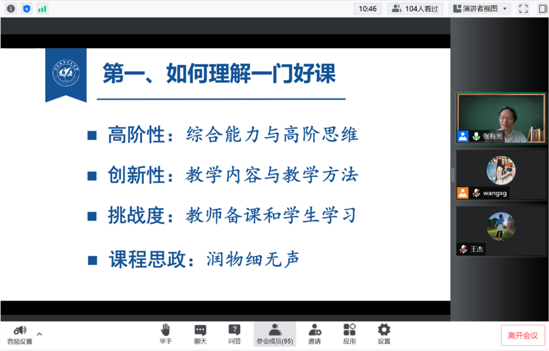 张有光教授从回顾青教赛参赛教师的体会入手,细致解读了青教赛的目的和意义,以及备赛要点,并从“两性一度”、课程思政等方面深入解析了什么是“一流课程”,进而引导教师们对教学设计、教学创新等的思考。