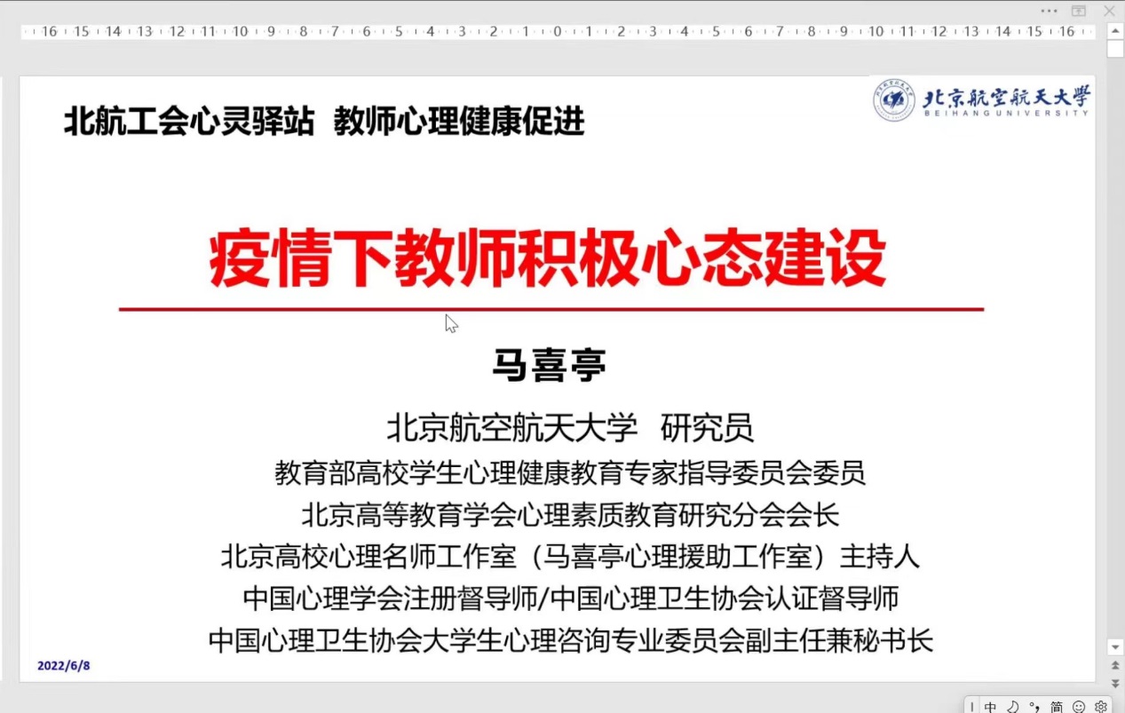 通过本次讲座,希望北航教职工不管是在疫情期间还是无疫情期间,都能通过调整自己的认知和情绪、加强运动或求助专业人士等方式,拥有一个积极的心态,建设自己美好的生活。校工会心灵驿站会一直在教职工身边,关注教职工的需求,为广大教职工提供温馨暖心的服务。