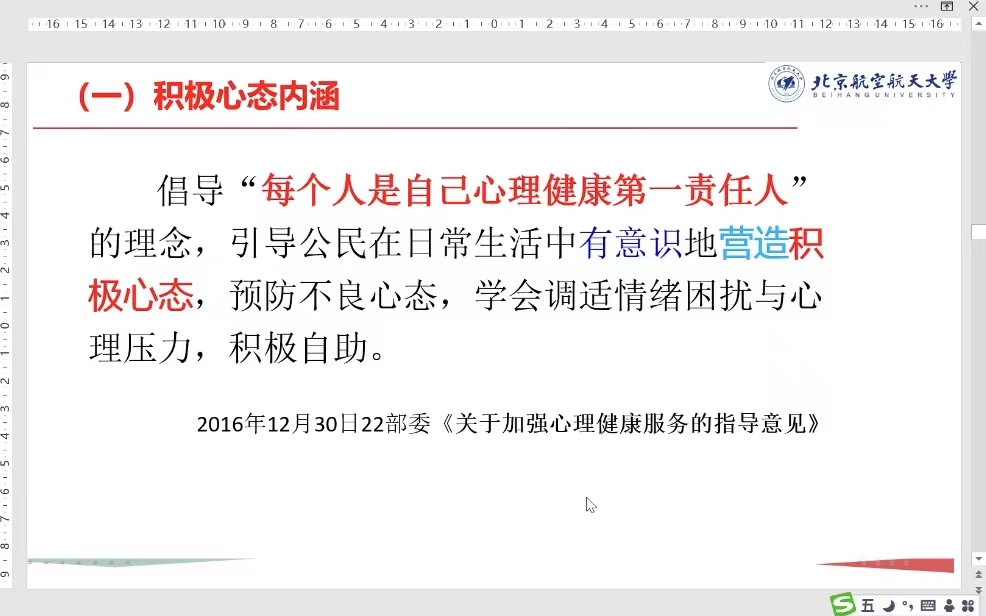 本次讲座,马喜亭老师从疫情期间我们可能出现的情绪困扰讲起,通过对疫情下人的心理行为、疫情下人的心理应激和正向的心理健康促进三个方面的讨论,重点跟我们分享了积极心态的内涵和建设积极心态的六大主要方面,即认知、情绪、人际、运动、资源、求助。