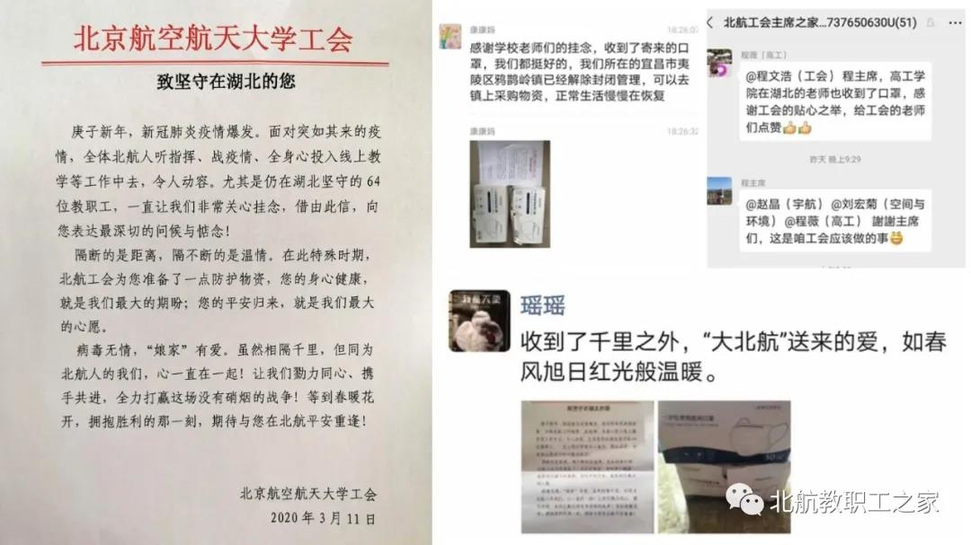 3月10日,校工会为滞留湖北的教职工加急预定的第一批口罩到货,工作人员马不停蹄赶到顺丰和邮政工作点逐一核对地址,并为62位在职教职工,3位退休教职工寄去每人100只口罩、慰问信一封和该批次口罩生产资质信息。仍坚守在湖北陆续收到口罩的老师们纷纷发微信“晒”幸福,表达了对学校关心关爱举措的感谢。
