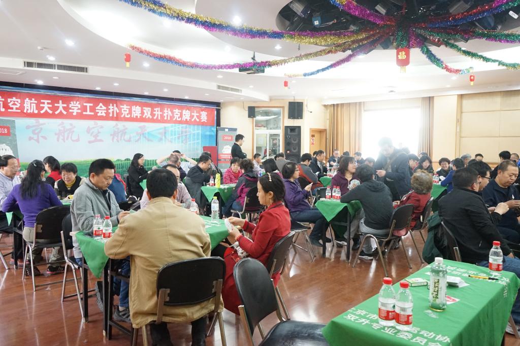 为丰富我校教职工业余生活,适当缓解工作压力,为棋牌爱好者提供交流切磋的平台,3月31日,2018年北航教职工双升扑克牌大赛在思源楼二层多功能厅举行。此次比赛主要由校工会主办、教职工棋牌协会承办,北京市棋牌协会大力支持。共有来自18个单位近150位教职工参加了比赛。