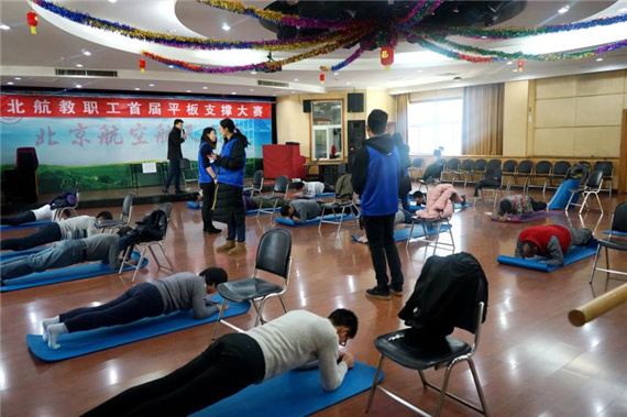 在比赛中,仪器科学与光电工程学院刘刚教授以30分31秒的成绩开创了北航首届平板支撑大赛的赛会纪录,成为本届大赛当之无愧的“平板支撑王”。