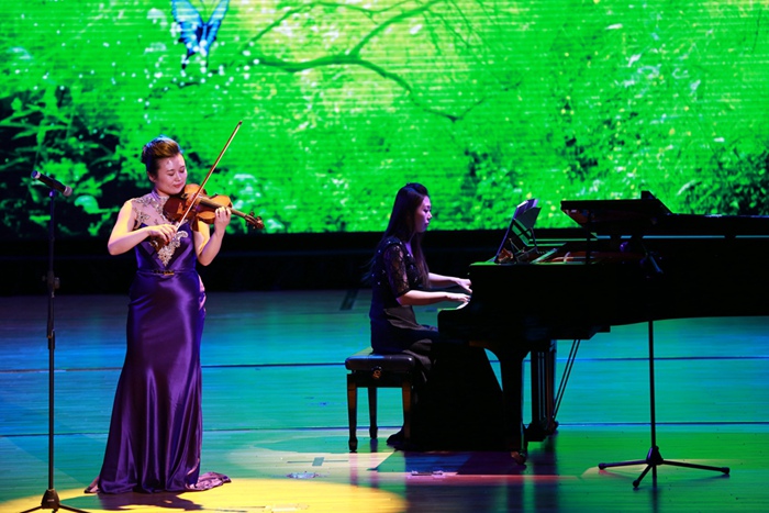 同时,校团委的张聪与大学时期的搭档周晓博演奏了小提琴、钢琴协奏曲《梁祝》,乐曲如泣如诉,张聪用指尖上的芭蕾再现了经典;古筝、琵琶二重奏《春江花月夜》邀请了机械工程及自动化学院副教授文力担任诗朗诵,为悠远的意境增添了几分诗意;档案馆的李桐邀请了四位有着共同爱好的学生组成了铜管五重奏,以神曲《小苹果》上场,并完美呈现了ragtime代表作《演绎者》,曲调诙谐,配合默契;经管学院的衣萌演唱了《匆匆那年》,校工会的温志明、机械工程及自动化学院的蒋茁用古典吉他和小提琴为其伴奏,三人忘情的表演将观众带回到属于自己青葱岁月;晚会的高潮由两位校友歌唱家的登台而掀起。98级本科生、青年美声歌唱家张冉带来一首《春天的芭蕾》,歌曲气势磅礴,展现了歌者雄厚的实力;97级本科生,我国著名青年歌唱家韩旭演唱了自己的作品《香格里拉》,声音甜美清亮,台风亲切,现场掌声雷动,很多曾经的师长和同窗都跟随着歌声追忆起往事,备受感动。