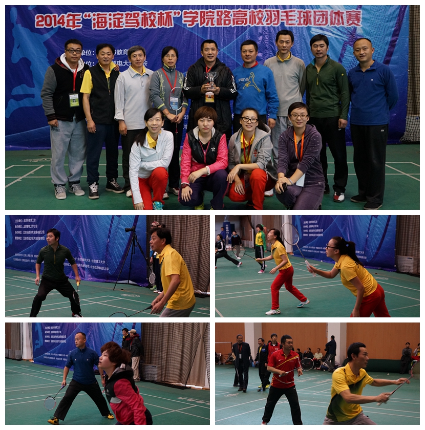 2014年12月6日,由北京市教育工会主办,海淀驾校赞助,北京邮电大学承办的2014年“海淀驾校杯”学院路地区高校羽毛球团体赛在北邮体育馆举行。北京邮电大学党委副书记兼工会主席董晞、北京市教育工会常务副主席刘欢、海淀驾校副校长徐小灵、我校工会常务副主席程文浩以及其他15所参赛高校的工会领导出席了活动。本届比赛共有16所高校260余名运动员参加。我校派出了14人组成的绝佳阵容,在小组赛中以全胜战绩成功突围,并在随后的淘汰赛中成功淘汰东道主北京邮电大学代表队杀入四强,在半决赛惜败给中国政法大学,止步半决赛,但在争夺三四名的比赛中击败北京大学医学部代表队荣获本届比赛的第三名。