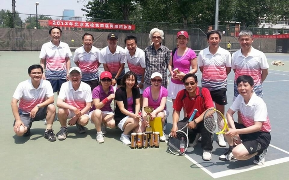 年北京高校第四届教职工网球团体赛日前结束。在校工会的指导和支持下,我校教工网球队经过预赛和决赛阶段的奋力拼搏,顺利进入前八名捧得优胜奖杯,取得历史最好成绩。图为网球队部分队员赛后合影留念。