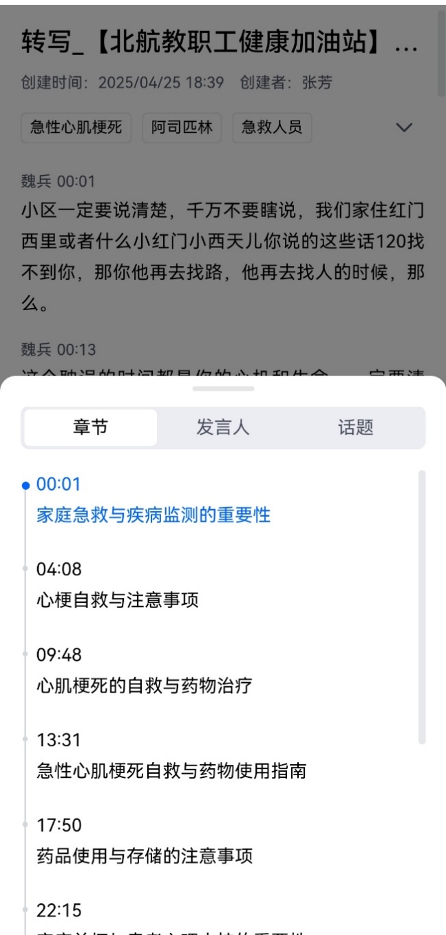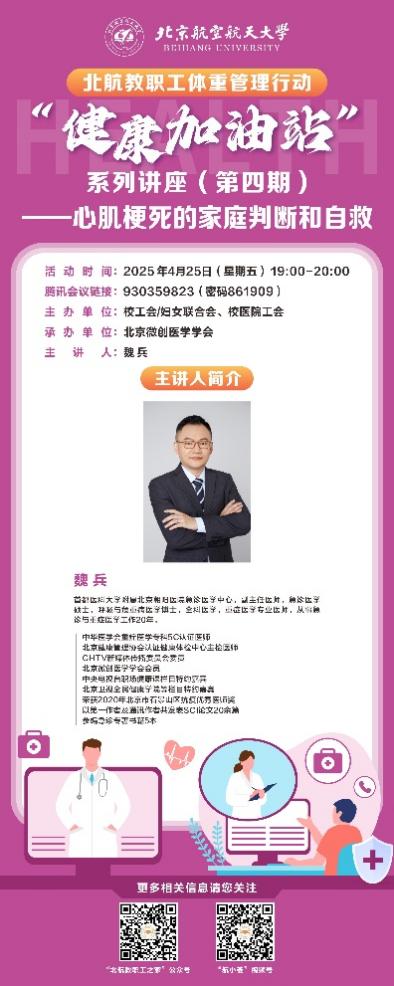 4月25日晚同一时段,第四期讲座“心肌梗死的家庭判断和自救”通过腾讯会议开展。主讲人魏兵来自首都医科大学附属北京朝阳医院急诊医学中心,是副主任医师,在急诊与重症医学领域工作20年,具备多项专业认证,还担任多个媒体健康栏目嘉宾。魏兵医生重点介绍心肌梗死在家庭环境中的识别方法,如典型症状表现等,以及发病后的紧急自救措施和送医注意事项。他强调早期识别和正确应对的关键作用,指导教职工们在紧急情况发生时如何为生命争取宝贵时间。
