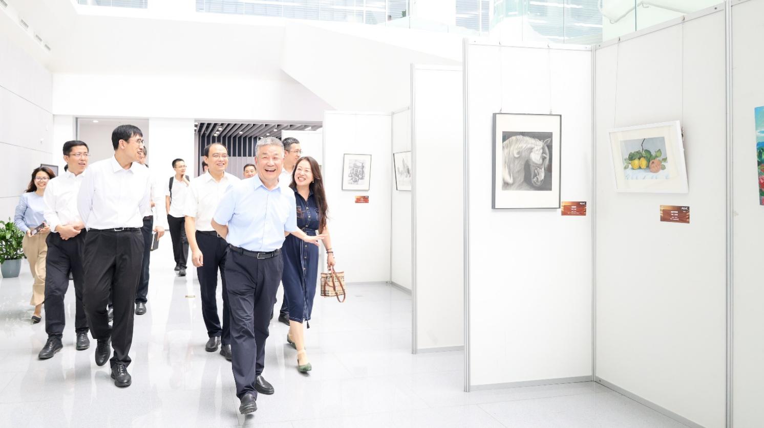 开幕式后,与会教职工代表率先有序参观展览。本次展览共展出180件北航一线教职工作品,涵盖油画、素描、水彩、彩铅、国画、书法、剪纸、插花、摄影等多个品类,每一件作品都凝聚着教职工在笔墨、光影、手作中传递的艺术情怀,以及对美好生活的真挚向往。大家在作品前驻足交流,从笔触、构图到创作背后的故事,沉浸式感受同事们在美育滋养下的艺术表达与生活热爱。