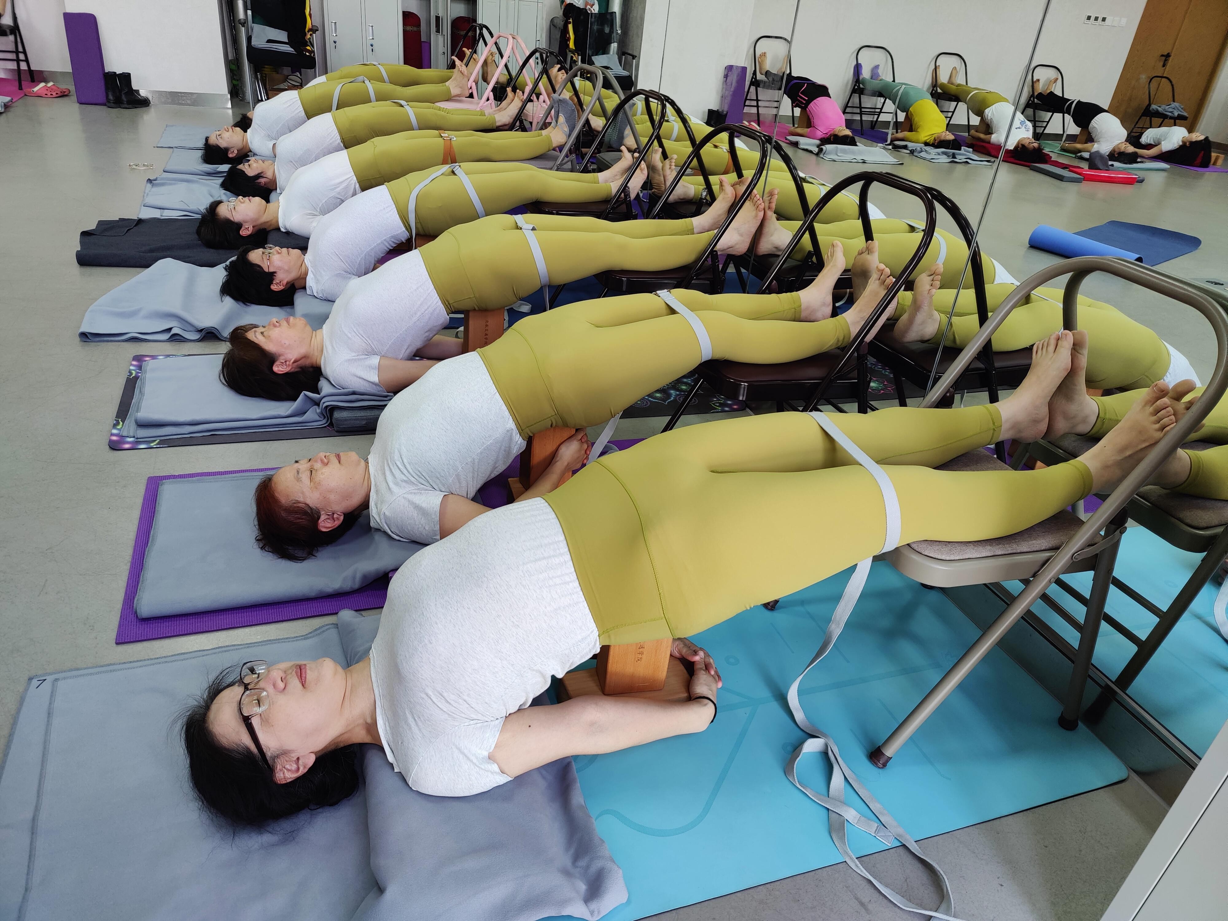 在瑜伽馆专业教练的指令下,老师们从双腿盘坐、静心冥想开始,通过精准的体位控制,利用艾扬戈理疗瑜伽对身体进行修复,净化了心灵,放松了肩颈,舒缓了疲劳的身体。