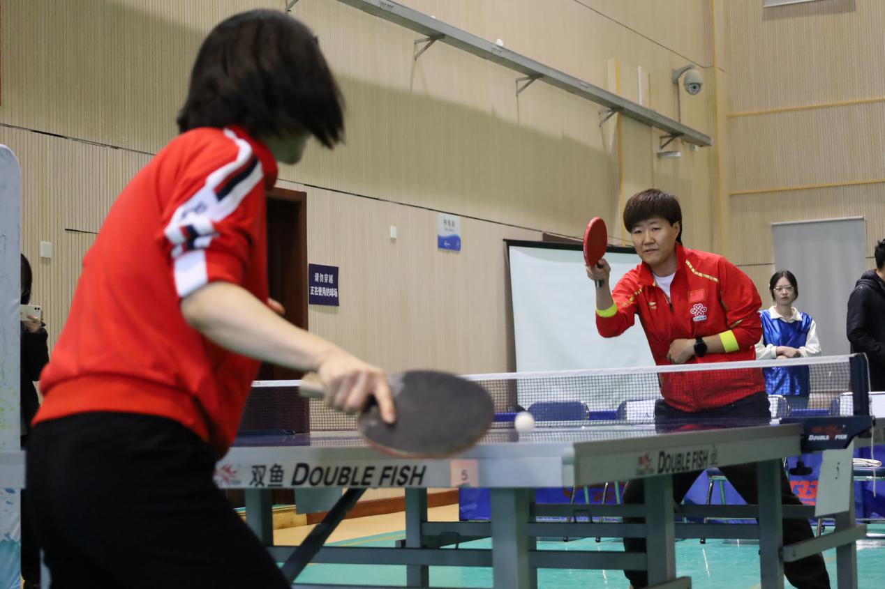 酣畅淋漓的表演赛——郭焱与张平数十次的回合、飘逸的削球、精彩的对攻……精彩乒乓技术表演盛宴,赢得师生们不断的惊呼赞叹。
