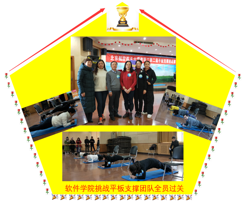 软件学院团队在王改英老师带队下,由学院副院长王丽华、工会主席杜孝平等五人组成的挑战团队分两批进行了挑战,按照平板支撑时间女职工不得少于2分钟、男职工不得少于3分钟的挑战规则,学院团队全员挑战成功!感谢校工会的积极组织与认真准备,既让大家锻炼了身体,也增强了会员的团队意识。祝贺各个部门工会都取得好成绩!