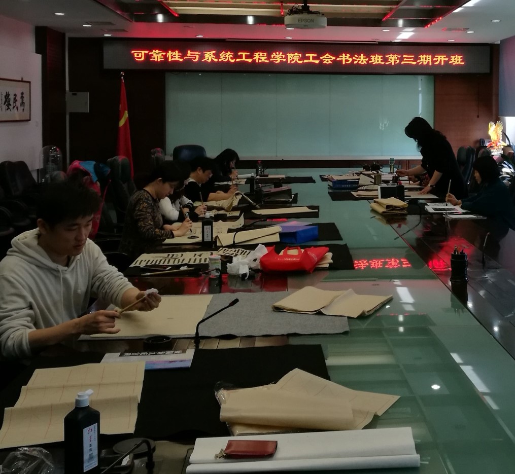 同样的温馨,也体现在可靠性与系统工程学院工会主办了三期的书法班,每个周四的中午,学院的会议室总会聚集一群喜爱书法的学院老师,课上有专业书法老师代课,为大家传播书法写作技巧。张叔农在上书法课时的感觉最具代表性:“以前总觉得午睡是最好的休息方法,现在发现,书法更能让人心静,它不但让人得到静寂的修心养性,让下午的工作有效率,还让人多收获写书法这一技能”。