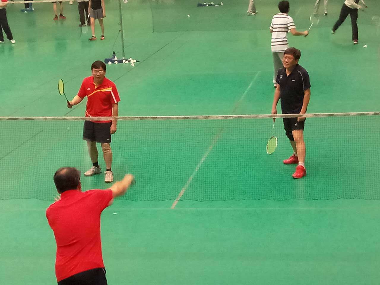 此次羽毛球团体赛分为男双、女双、混双,男双、女双分别进行,采取小组内单循环五局三胜制,再取小组前两名进行淘汰赛,小组赛由不同的院系代表队抽签决定顺序比赛。老师们早早地就进入场地进行热身训练,针对不同的院系代表队,积极商量对策。教练赵明老师和队长阎超老师提出“田忌赛马”的比赛方案,队员们纷纷赞同,并积极组合搭档进行训练、交流技术。