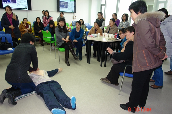 卢艳医生首先为大家介绍了心肺复苏的急救知识及操作技巧,并通过实践示范操作讲解心肺复苏急救技术动作要领。培训过程中,女教师们积极参与,争相要求进行实践操作训练,对操作不懂之处与医护人员进行探讨与沟通。通过卢艳老师的手把手指导,女教师们初步掌握了心肺复苏知识。