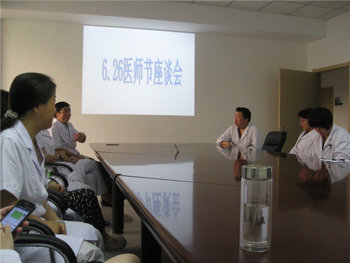 为庆祝6.26医师节的到来,激发全院医务工作者积极投身医疗事业及医院建设的热情,2015年6月26日下午,我院举办了以“医患同心 关爱医师”为主题的医师节座谈会,党总支书记李成智、副院长曹丽娟、工会主席刘岩、各工会小组长及部分科室代表参加了本次座谈会。