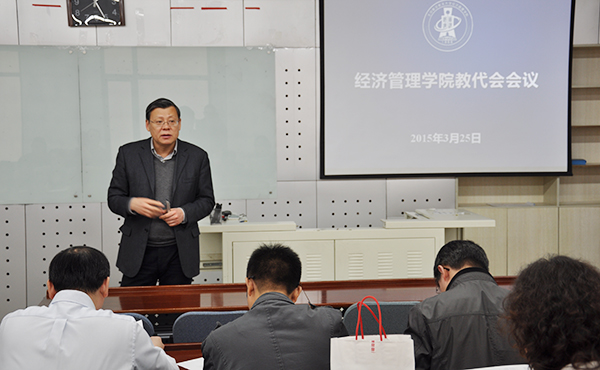 2015年3月25日中午,经管学院在新主楼A618教室召开2015年度第一次教代会暨基层干部工作扩大会议。学院党委书记刘志新通报了2014年度教代会提案答复及落实情况,并做了学院2014年度财务决算报告和2015年度财务预算报告,同时围绕2015年度教师业绩考核方案设计与各位教代会代表进行了汇报并展开讨论。学院教代会代表,各系主任和副主任,教工支部书记和副书记,中心主任和副主任,工会委员等40多人参加会议。