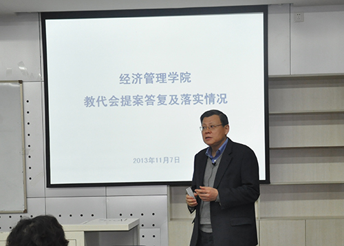11月7日,经管学院在新主楼A618召开了2013年度教代会提案答复及落实情况通报会。学院教代会代表、各系主任、支部书记、中心主任和副主任40多人参加会议。