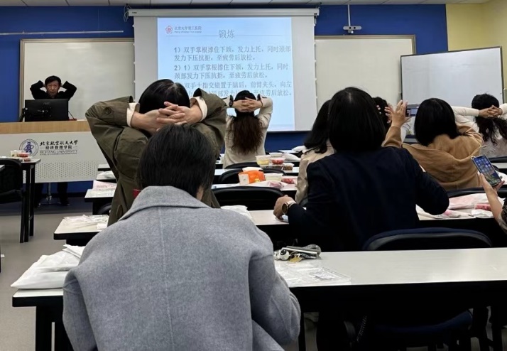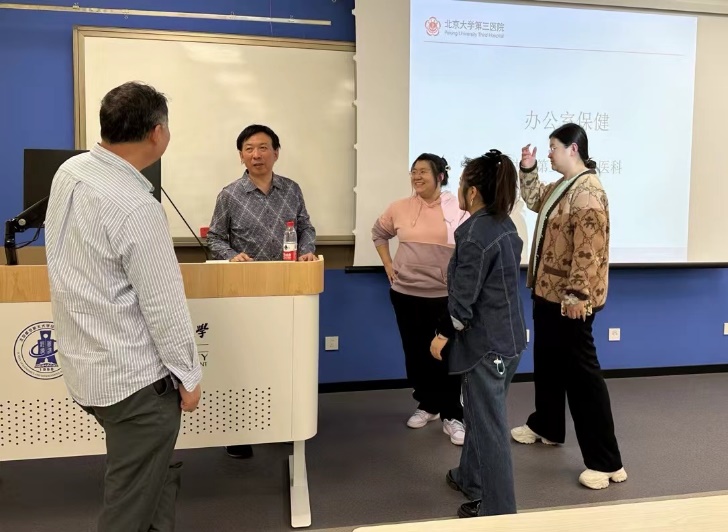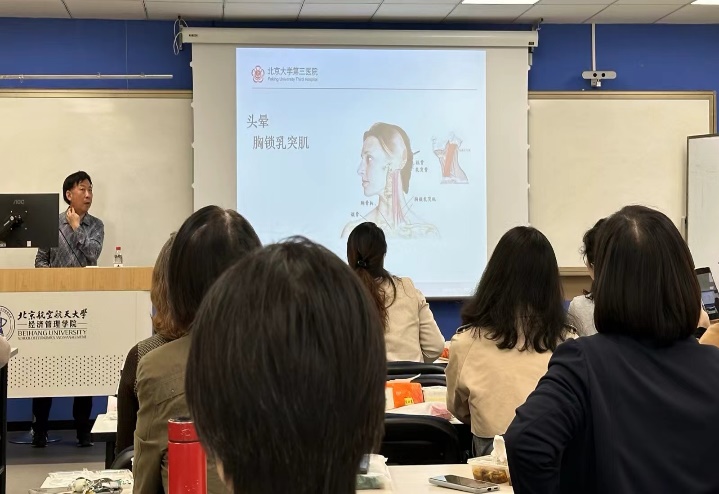 活动特别邀请了北京大学第三医院中医科副主任、针灸学博士霍则军主任医师,为教职工详细讲解了办公室常见的健康隐患。随着科研压力加大和长时间伏案工作的增加,颈椎病、腰椎病、胃病、视疲劳等问题困扰着许多教职工。针对这些问题,霍大夫结合丰富的临床经验,提供了专业的预防建议,并教授了简便实用的按摩手法和艾灸等传统疗法,帮助大家在繁忙的工作中科学调理身体,提升生活质量。