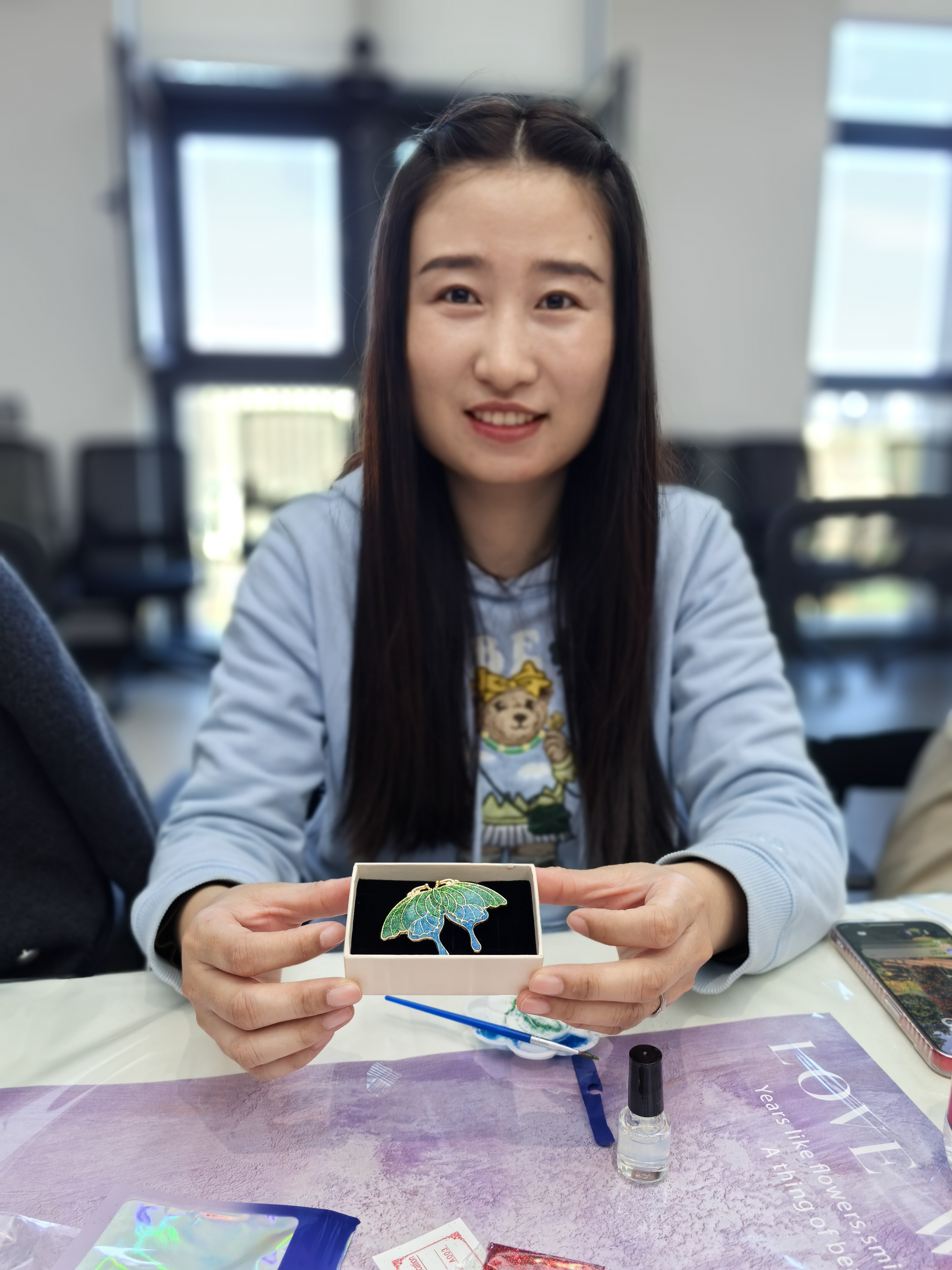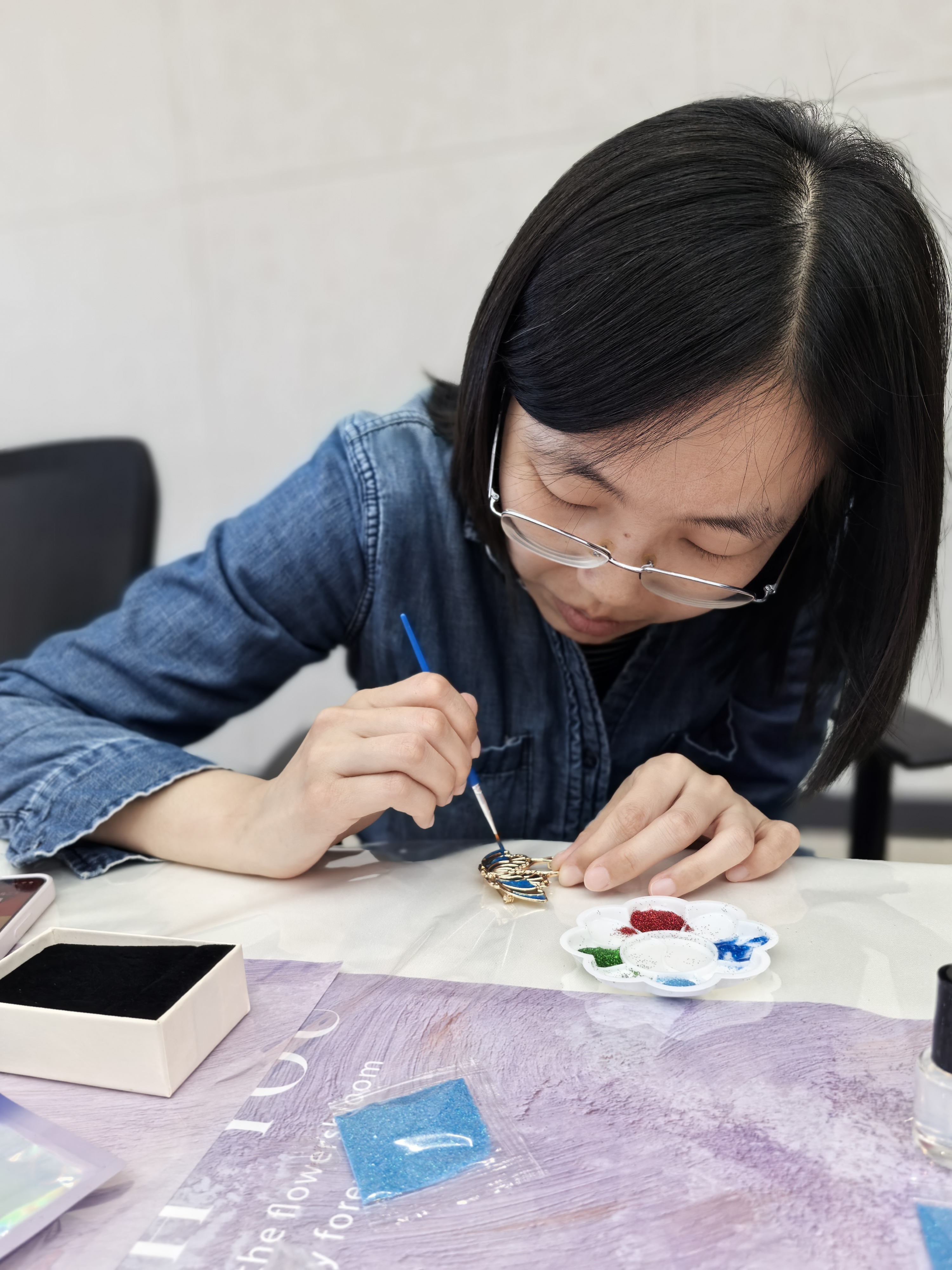 活动下半场,手作专家靖然老师引领教师们深入体验了传统烧蓝技艺之美。她不但展示了烧蓝技术从皇家御用到现代航天器镀膜技术的演变历程,并详细解析了这一传统工艺的制作流程和步骤。还带领大家一同欣赏了众多精致的烧蓝作品。在她的指导下,教师们亲自动手实践,根据个人喜好进行设计、调色和上色。随着教师们手中的画笔舞动,一件件融合了多种元素的胸针逐渐成形。烧蓝技艺中的“蓝”代表着智慧的结晶,正如物理学院女性教师们所展现的坚韧不拔的探索精神。