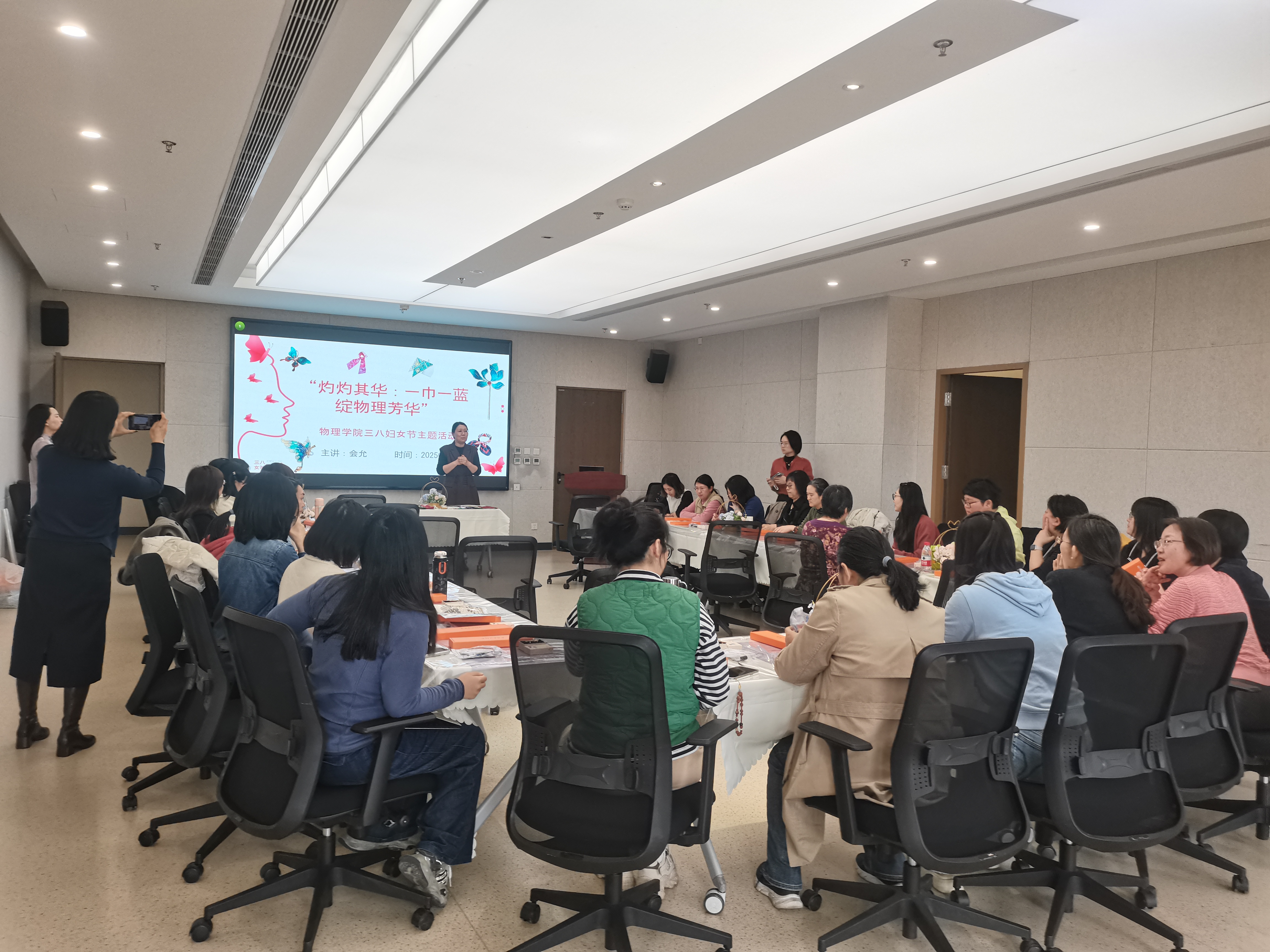 为全力支持教师们冲刺国家自然科学基金项目申报,物理学院工会将“灼灼其华:一巾一蓝绽物理芳华”为主题的三八妇女节活动推迟至3月19日下午2点在学院会议室C511举行。活动由院工会主席金硕主持,旨在以“学术/教学优先、暖心护航”的方式向为物理学院发展做出卓越贡献的女性同仁致以敬意。40余位教师暂时放下手中的工作,沉浸式体验“丝巾美学+非遗手作”的艺术疗愈之旅,以适度放松的节奏为科研和教育教学征程注入新活力。