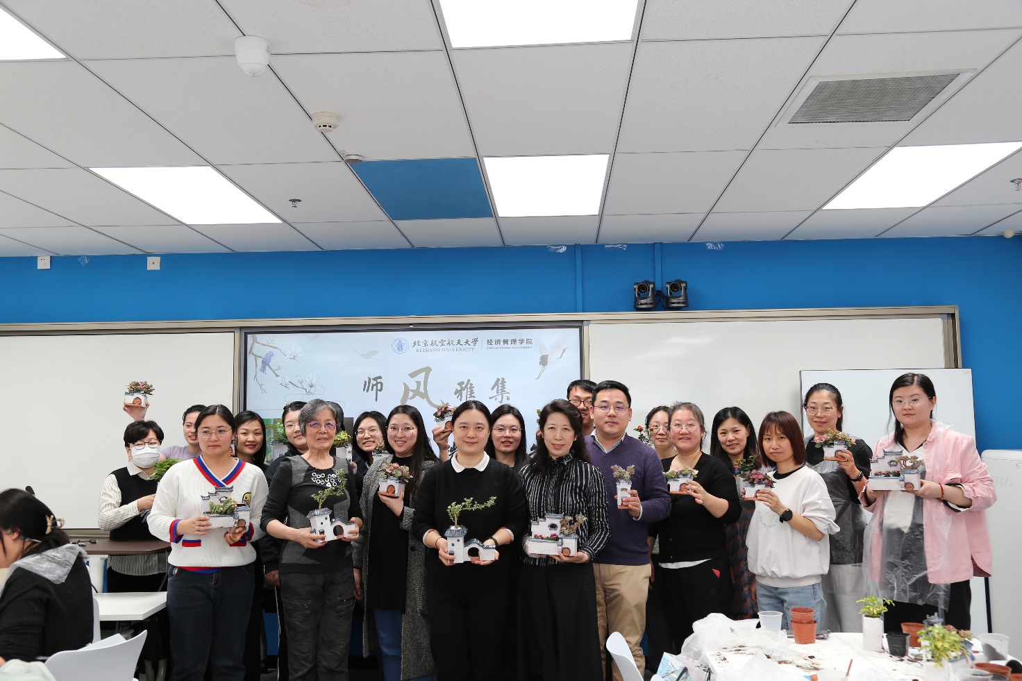为丰富教职工的文化生活,缓解工作压力,倡导健康、快乐的工作理念,3月19日下午,经济管理学院工会在新主楼A1148成功举办了“师风雅集”主题活动——“绿动春光”徽派微景观手作体验活动。本次活动是“三八”妇女节系列活动之一,活动吸引了经管学院工会主席牟晖老师,副主席任晖老师和关工委副主任高志红老师在内的三十余位教职工积极参与,大家在轻松愉悦的氛围中,通过创意手作感受春日的勃勃生机。